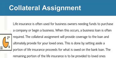 A collateral assignment of life insurance is a conditional assignment appointing a lender as an assignee of a policy. Essentially, the lender has a claim to some or all of the death benefit until the loan is repaid. The death benefit is used as collateral for a loan.